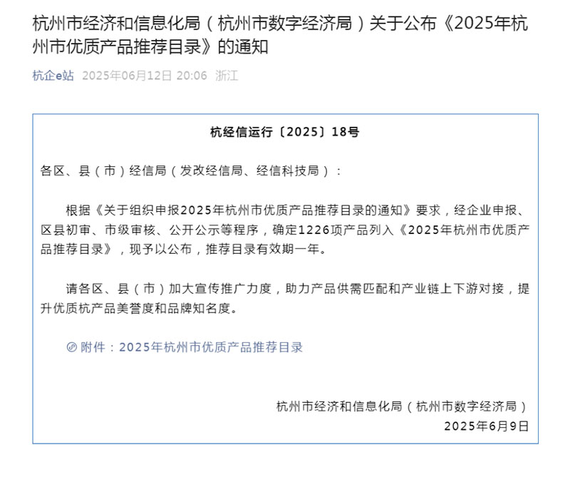 “杭州市优质产品推荐目录”是杭州市经信局贯彻落实“新制造业计划”的一项重要举措,旨在通过各项技术经济和质量方针对杭州市好产品进行认定和展示,加大优质产品的推广力度。入选产品不仅在技术研发、数字化、智能制造等领域表现卓越,更需要具备显著的市场应用价值。